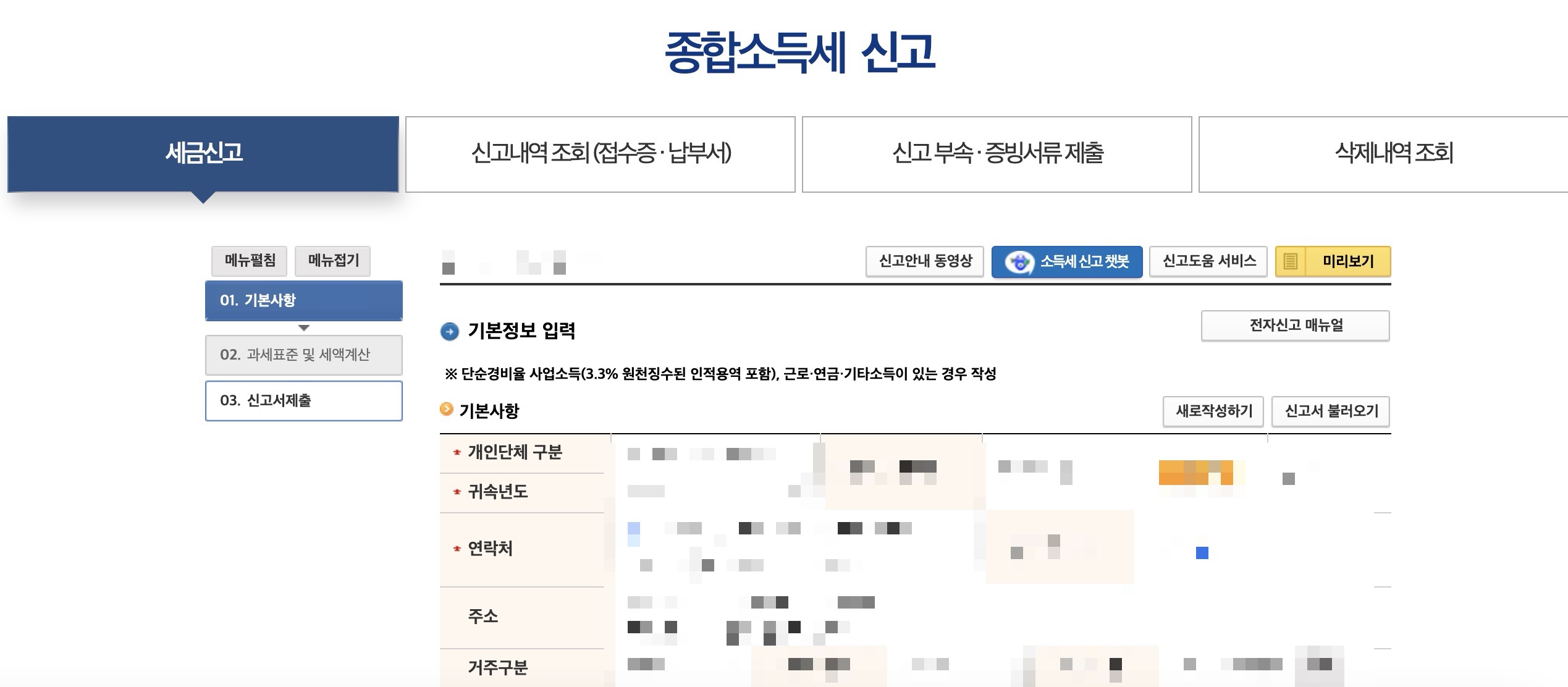 3. 세금신고 메뉴에서 아래와 같이 나오면 개인정보를 입력(전화번호 등)