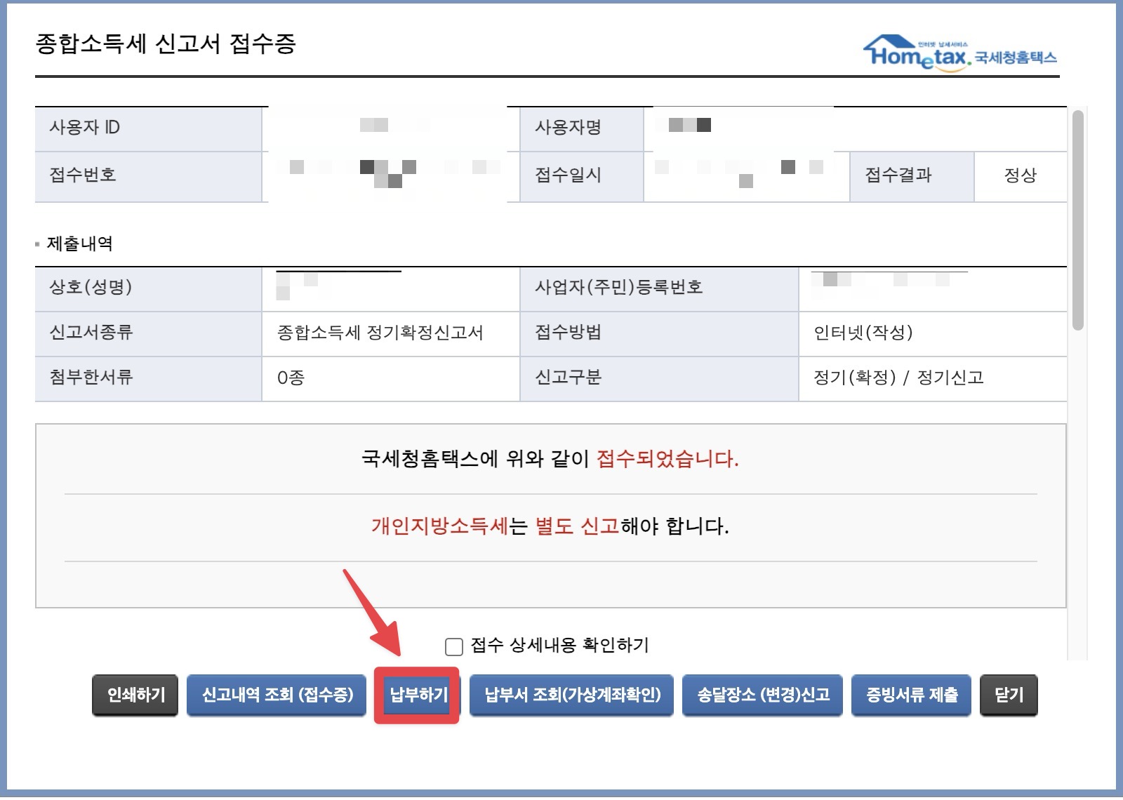 그리고 종합소득세 신고서 접수증 나오면 접수 상세내용 확인하기 체크한 후에 나오는 화면에서도 확인 체크를 한 후에 <납부하기>를 클릭.