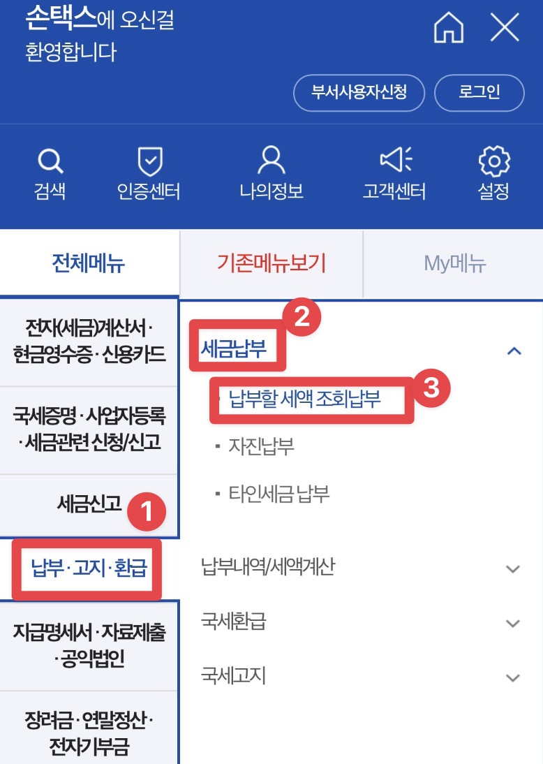 로그인을 하고 아래 메뉴로 접속하면 위에서 본 세금 납부화면을 볼 수 있다.