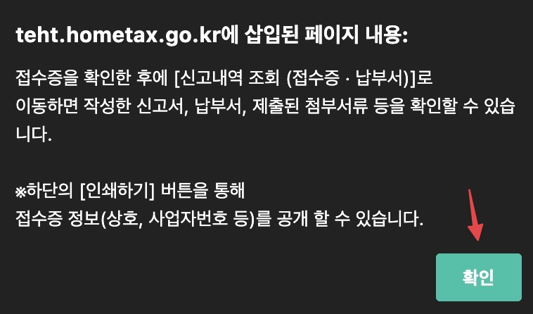 신고서 제출하기 버튼 클릭하면 아래와 같이 "수정없이 바로 제출 하시겠습니까?" 안내창이 나옴. 여기서 확인 버튼 클릭.