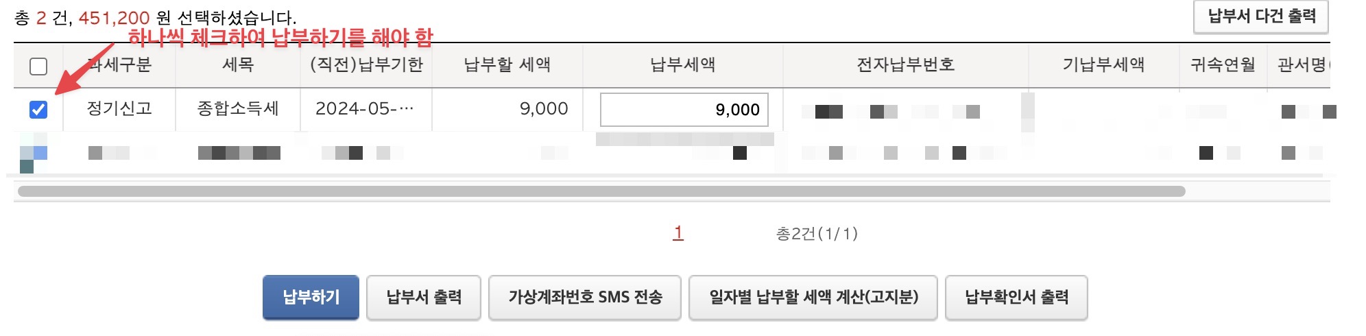 납부할 세액이 아래와 같이 여러개 있는 경우 하나씩 선택하여 납부를 해야 함.
