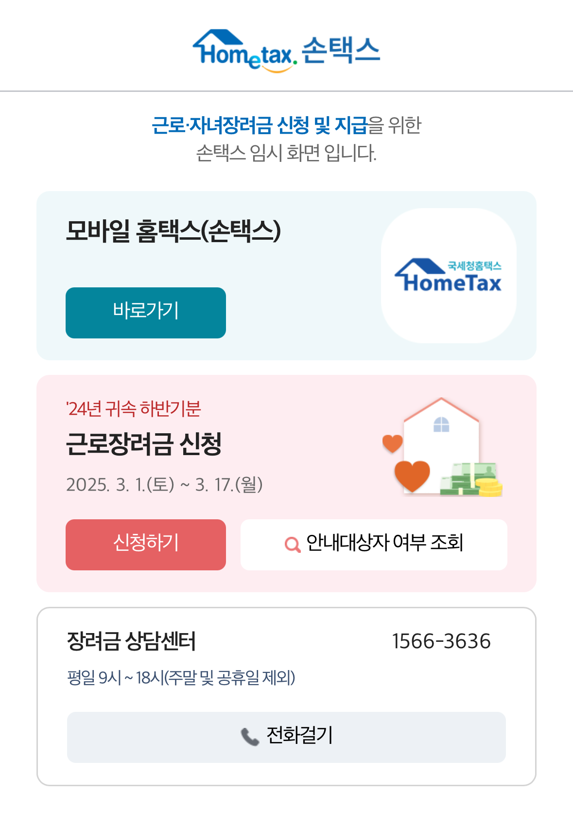 - 신청 대리 서비스: 스스로 신청하기 어려운 경우, 국세청 장려금 상담센터(1566-3636)로 전화하여 신청 대리 서비스를 요청할 수 있습니다.