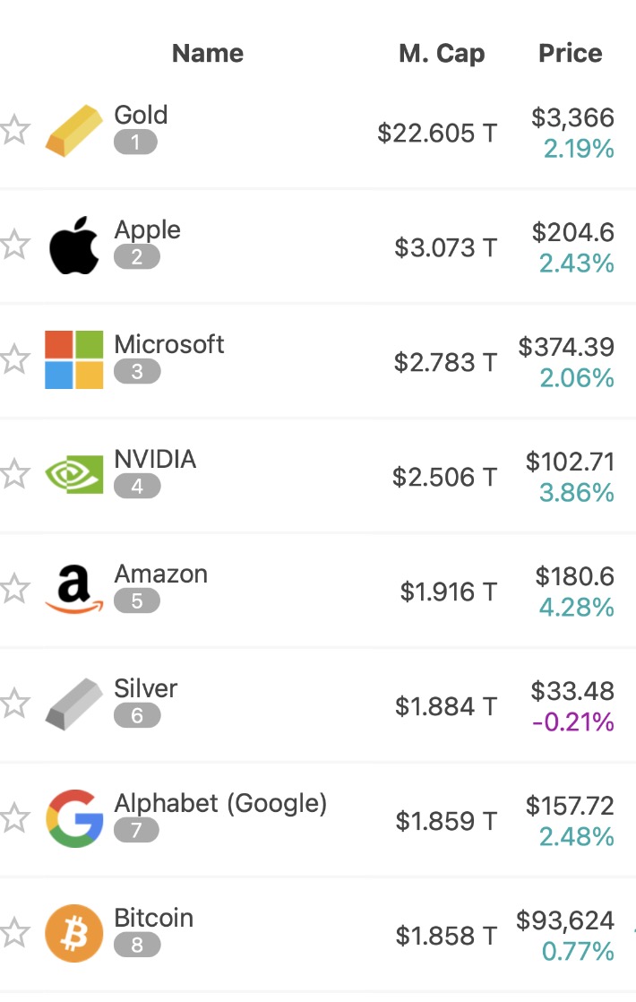 먼저 지구상에 현존하는 자산 시가총액 순위를 비교하면 단연 금이 1등입니다.