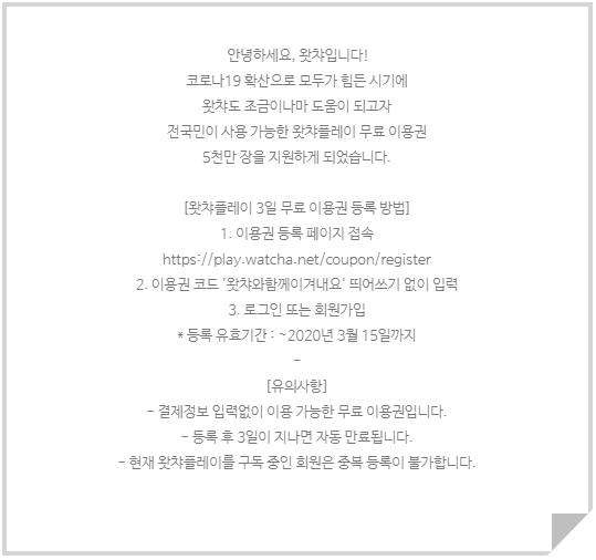마침 왓챠플레이에서 코로나로 집콕하는 사람들을 위해 3일 무료쿠폰까지 주고 있는데 주말에 등록하고 미드 정주행 하면 코로나 블루 극복할 수 있습니다.