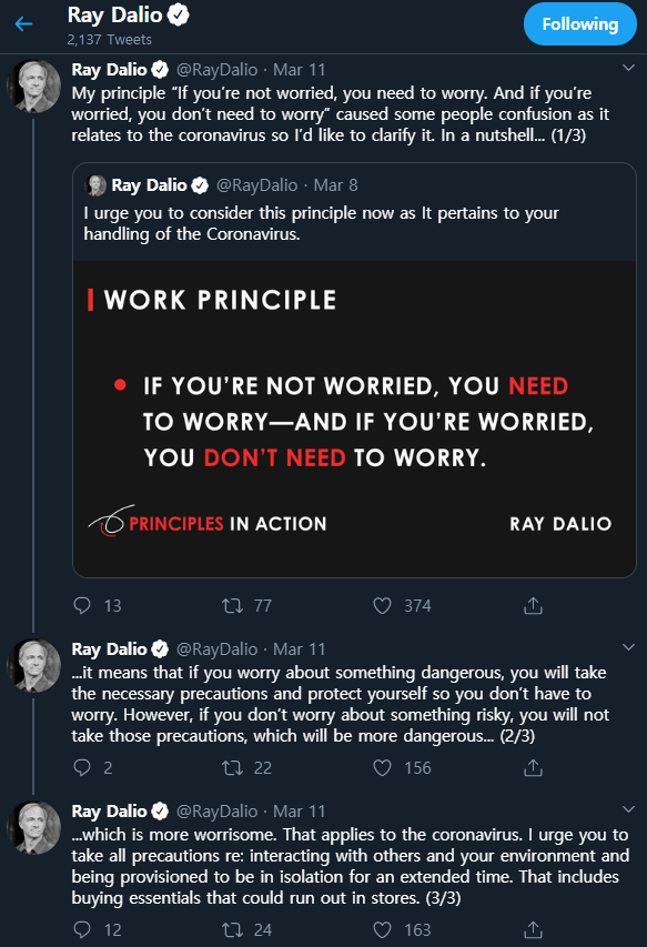 그래도 어느 한 영화나 드라마, 오더블만 할 경우 지루해질 수 있어요. 이 때 자기가 좋아하는 외국 배우나 가수, 정치인, 금융가 ... 등 뭐가 되었든 모델을 하나 찾아서 그 사람에 관한 기사, 트위터, 페이스북을 틈틈히 보면서 읽는 거에요. 영기서도 #표현찾기 할 수 있어요. 저같은 경우는 레이달리오라는 사람을 좋아하는데 이 사람의 트위터를 팔로우 하면서 좋은 표현들을 찾습니다. 최근에는 이런 말을 했어요.